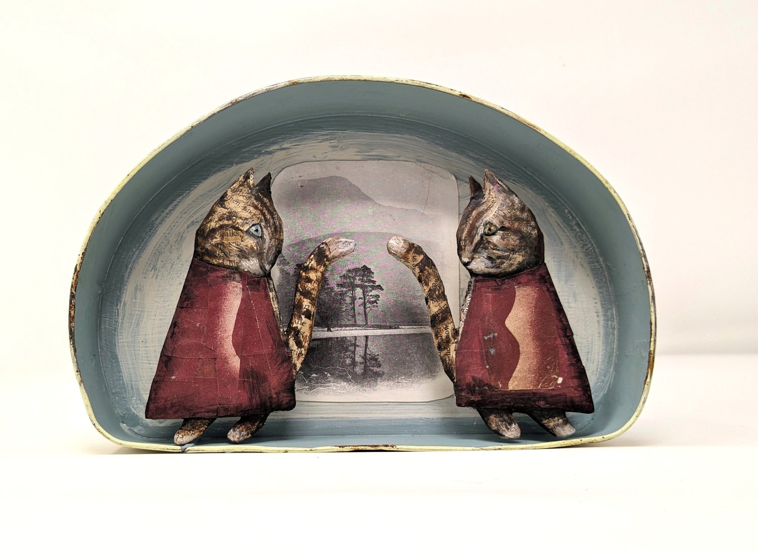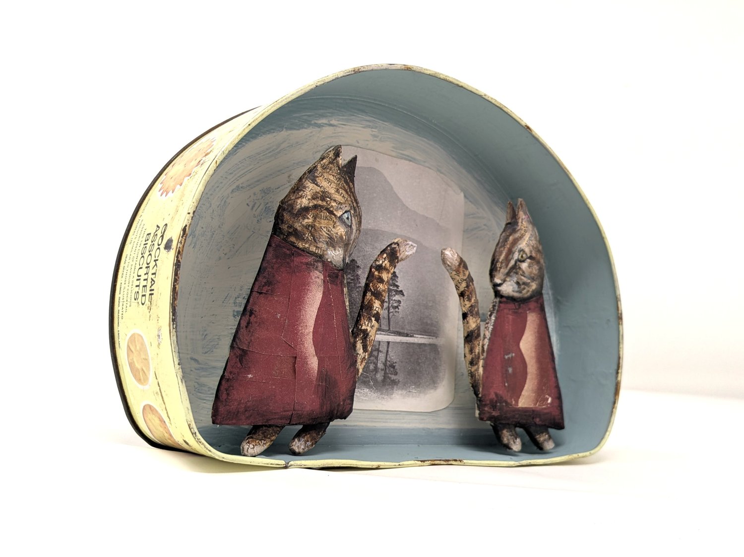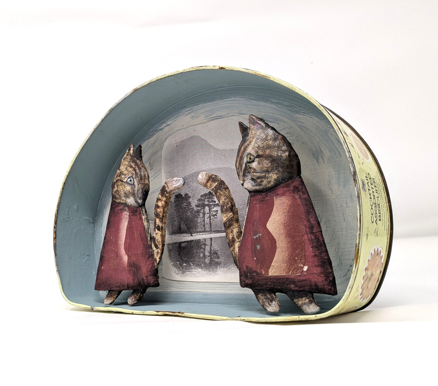 Papier-mâché, collage and gouache in a vintage tin