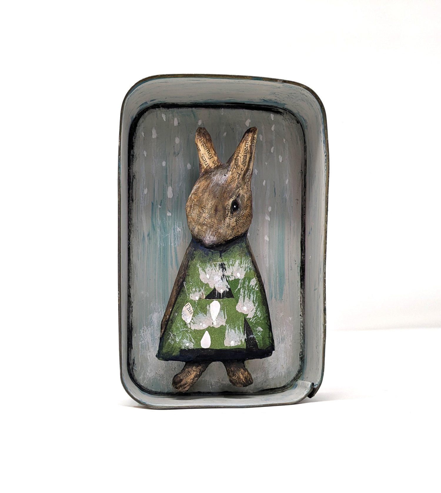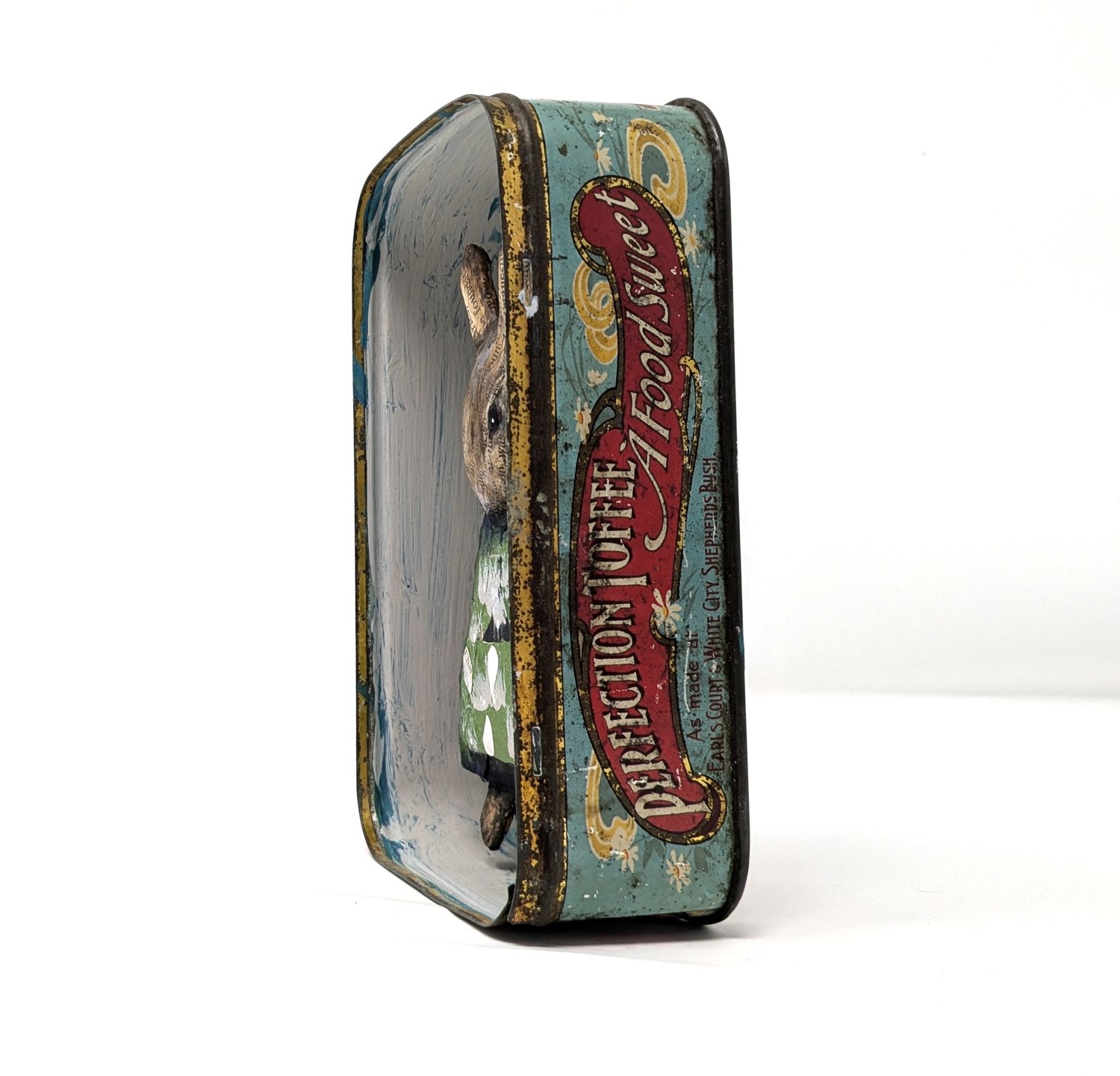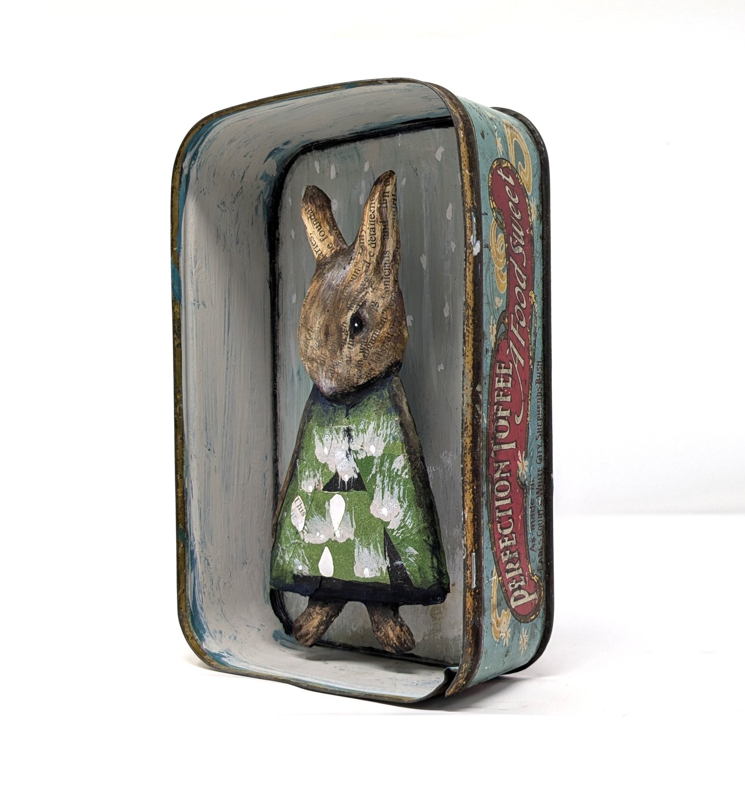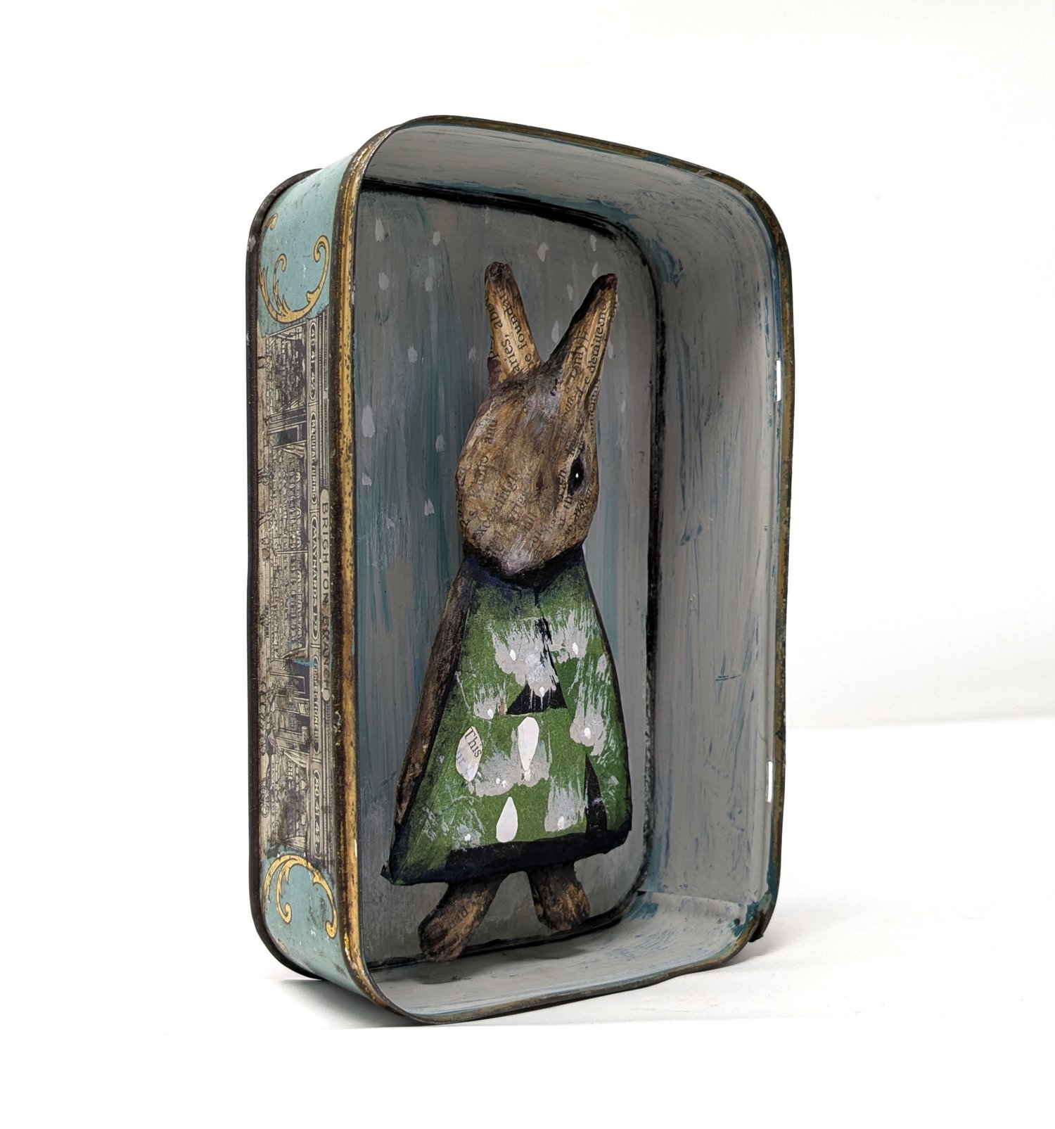 Papier-mâché, collage and gouache in a vintage tin